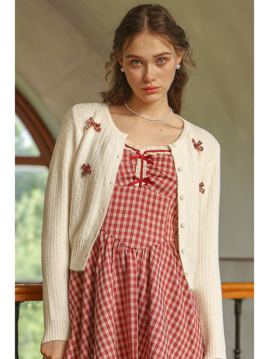 Plaid Bow Embellished Knit Cardigan