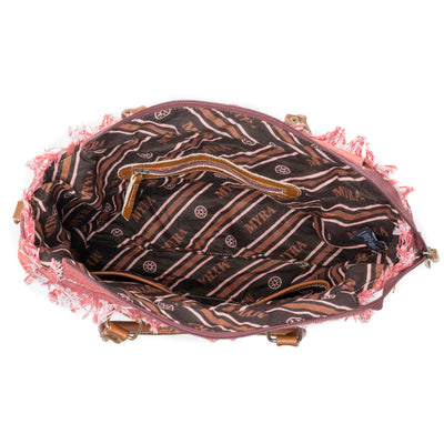 Bold yet practical, the Myra Coastal Steel Upcycled Canvas Tote in Blue blends rugged charm with functional elegance. Crafted from durable upcycled canvas with leather accents, this canvas tote bag features distressed edges and typography details that give it a vintage flair. Spacious enough for your daily must-haves, this large tote bag is perfect for both weekday commutes and weekend escapes. Whether you’re heading to the market or catching up with friends, this designer tote bag brings laid-back sophistication to any outing.