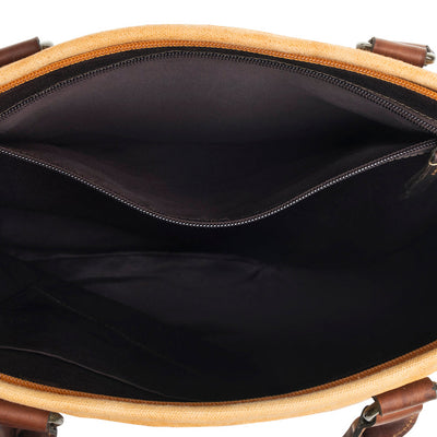 Make a grand presentation with this tote - it's a perfect blend of vintage charm and modern functionality. This spacious canvas bag features whimsical French-inspired overprinting, evoking the elegance of Parisian cafýs. Accented with luxurious leather handles and trim, it's ideal for daily errands or weekend getaways. Embrace your inner Francophile and carry a piece of artisanal elegance wherever you go. Zipper-close top.