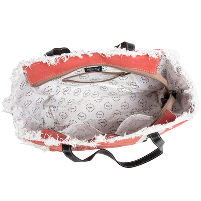 This crossbody bag features plenty of space to carry a variety of items, from clothes to groceries! A dimensional front, with its gorgeous two-tone canvas, fanciful cactus scene overprinting, and frayed-edge treatments make for a delightfully textured look. An additional zippered pocket on the back adds handy convenience. Zipper close top and durable dark leather carrying/shoulder straps finish everything out.