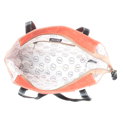 The distinctive vintage design of this wonderful bag makes for a wonderful fashion statement! It features woven canvas, special leather and brad accents, and wording overprint. Zipper-close top, canvas back with zippered pocket, and leather carrying straps. The vintage ranch feel is always eye-catching and great for any wardrobe, plus it has room for all your daily essentials!